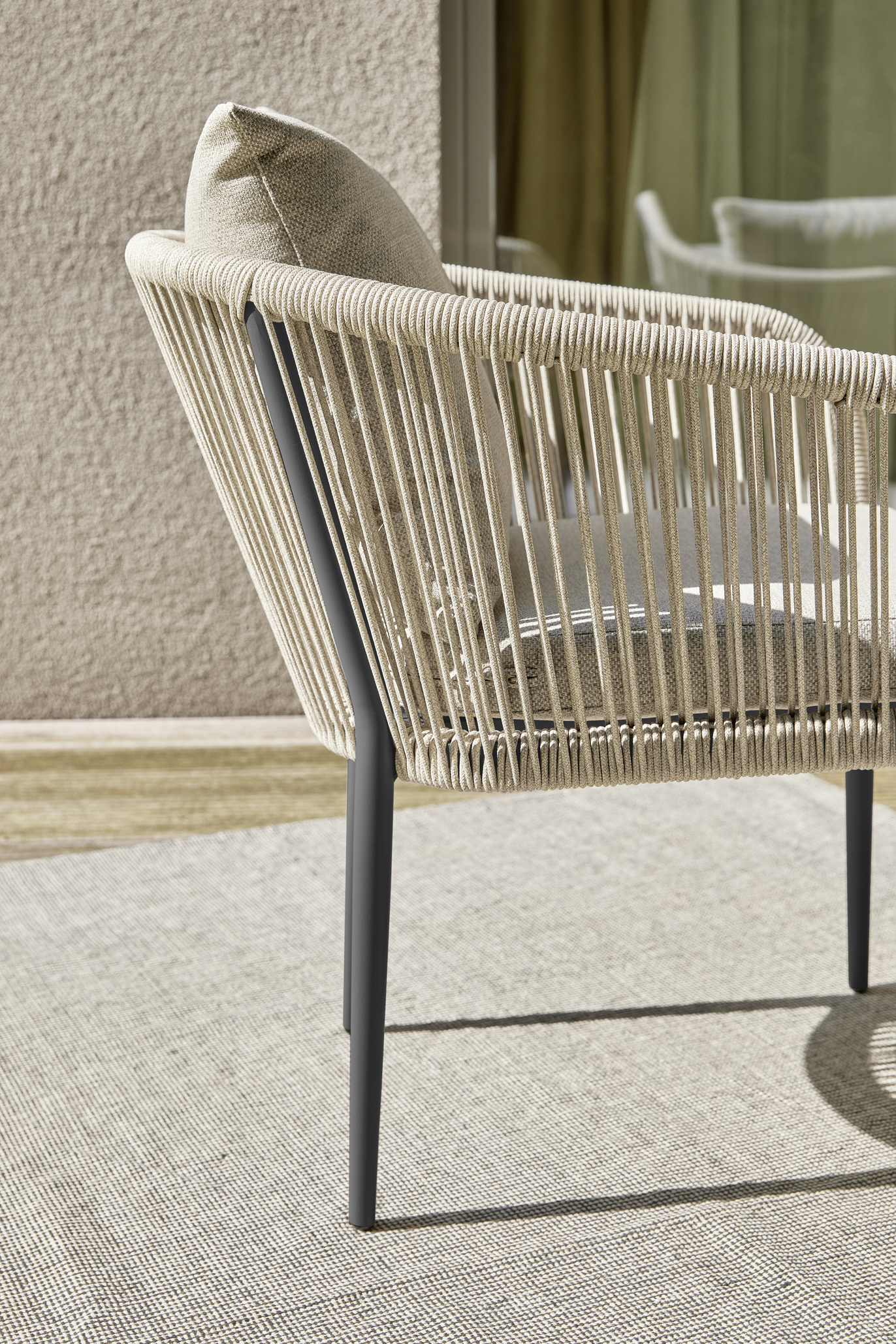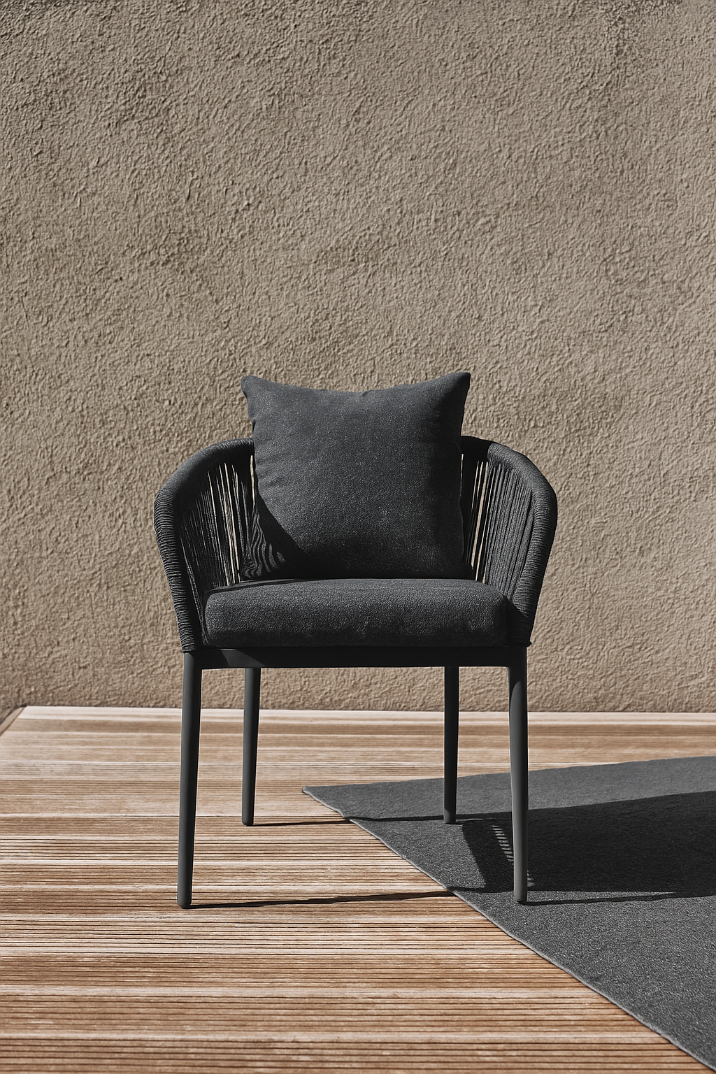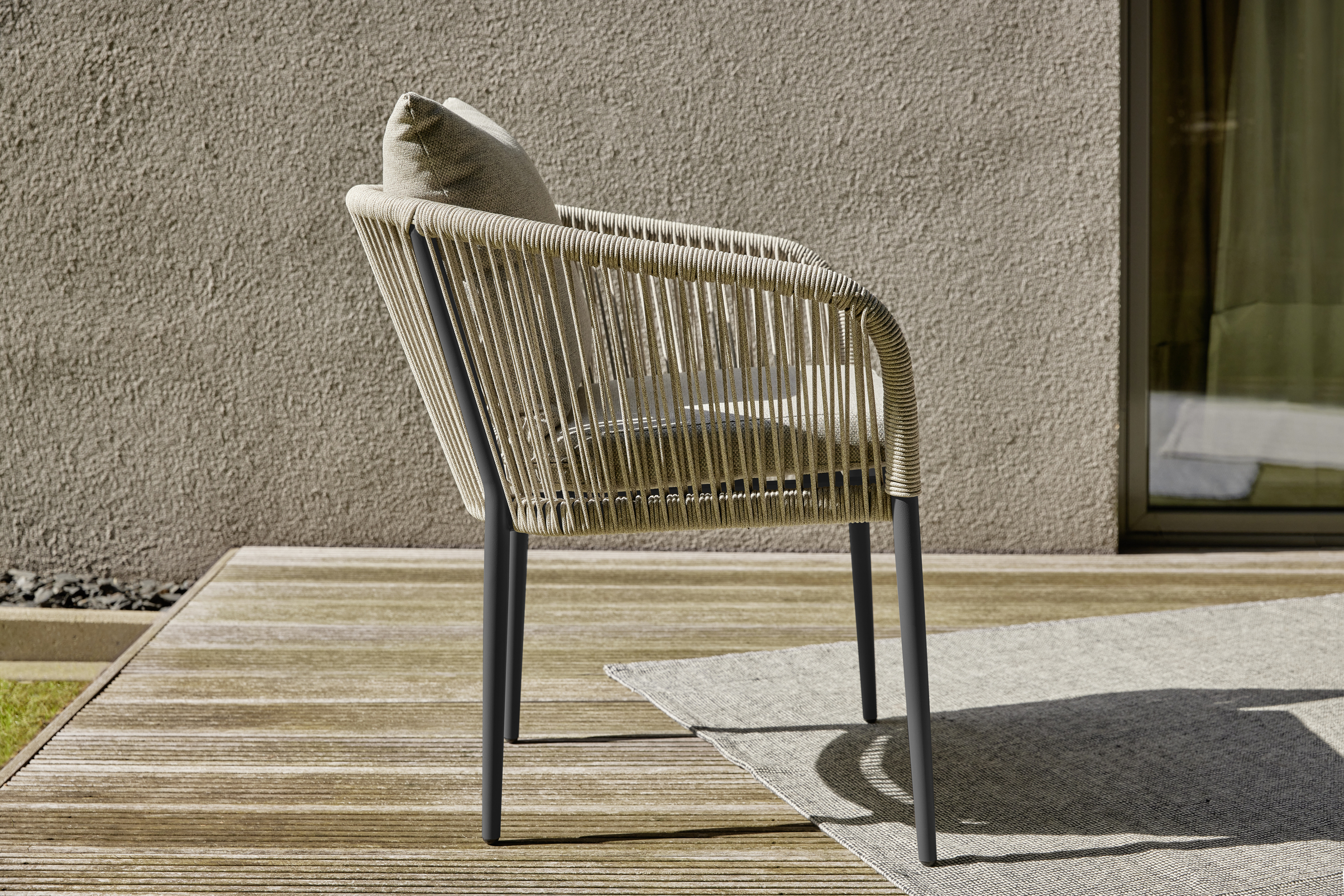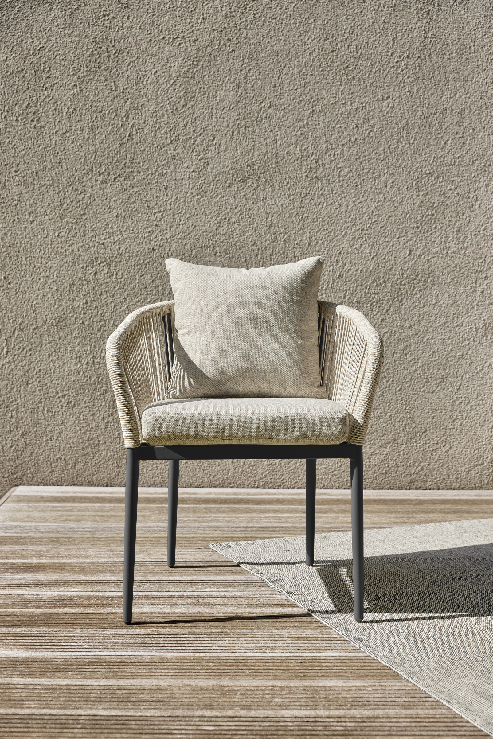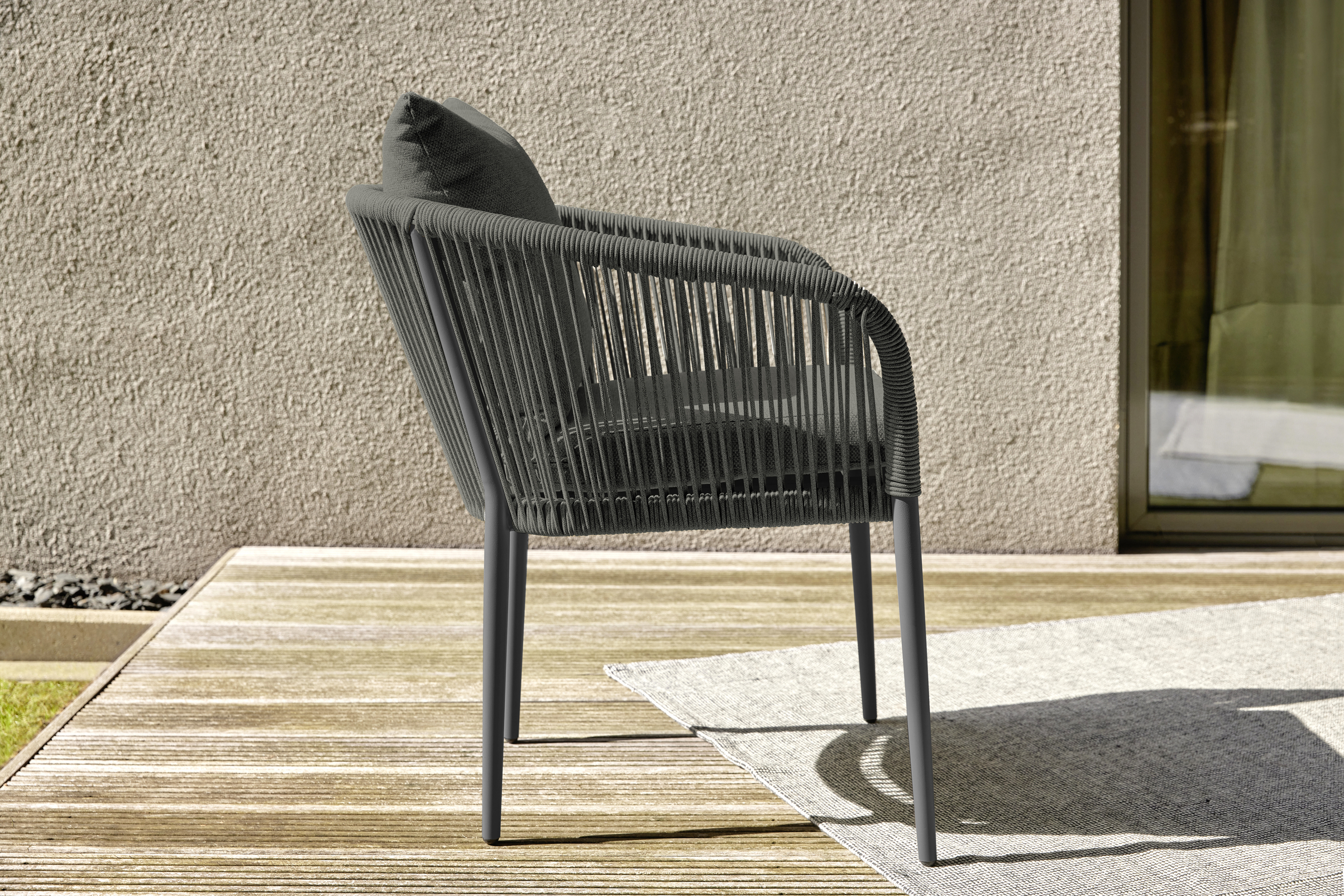 Stapelstuhl in modernem Design. Robust und platzsparend dank intelligenter Stapelbarkeit. Erhältlich in zwei zeitlosen Farbtönen: Sandstone und Graphit Grey. Gefertigt aus hochwertigem Rope-Slimline und pulverbeschichtetem Aluminium bietet er langlebige Stabilität. Inkl. Sitz- & Rückenkissen mit wasserabweisendem Olefin Stoff. Vielseitig einsetzbar, perfekt für Gastronomie, Eventbereiche sowie moderne Einrichtungen aller Art.