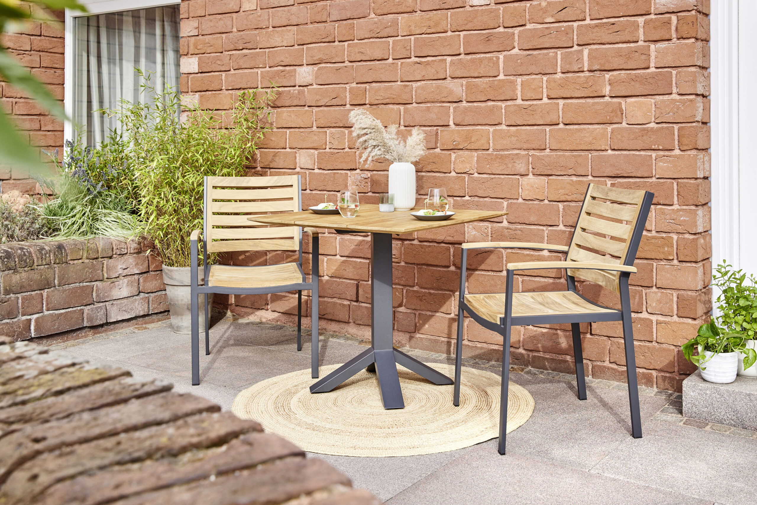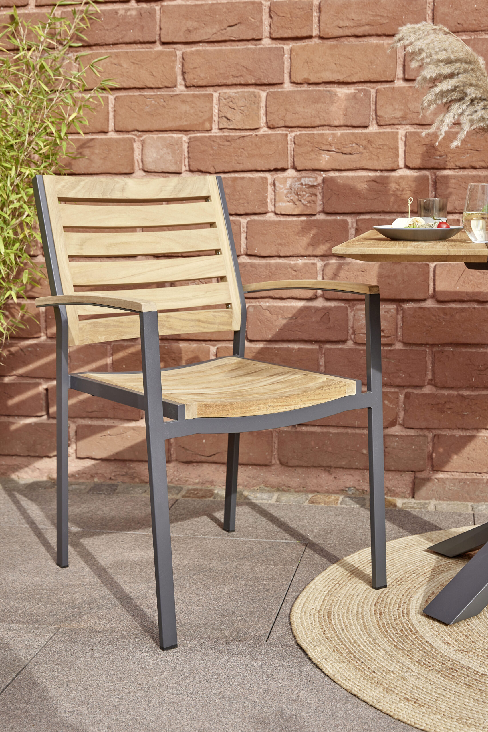 Hochwertiger schwerer Rahmen aus Edelstahl in Dunkelgrau, pulverbeschichtet mit halbhoher Rückenlehne, kombiniert mit Premium Teak.